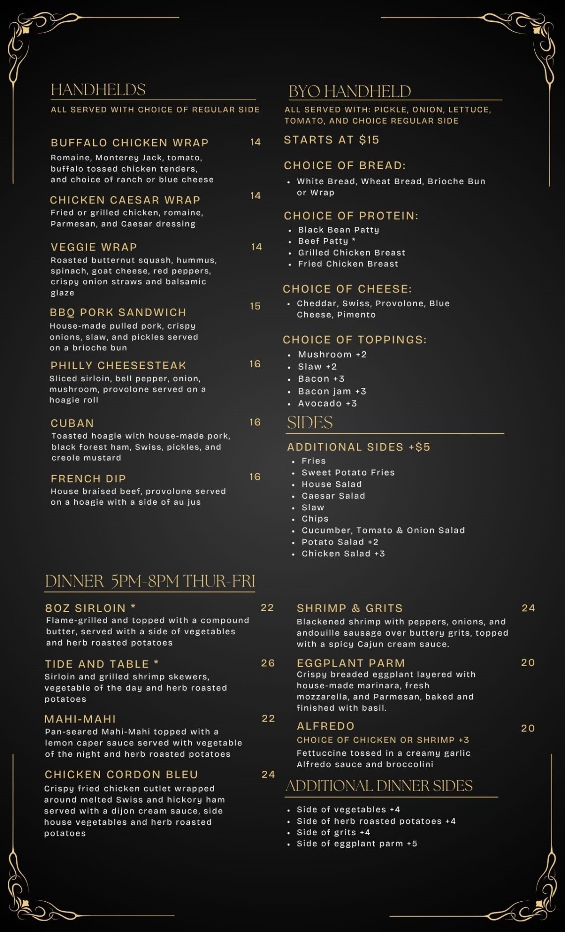 Dinner service is available Thursday and Friday from 5:00 pm until 8:00 pm.